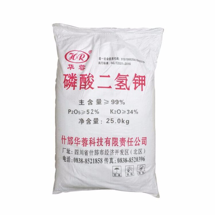 2.農(nóng)業(yè)上用作高效磷鉀復(fù)合肥;磷酸二氫鉀產(chǎn)品廣泛適用于各類(lèi)型經(jīng)濟(jì)作物、糧食、瓜果、蔬菜等幾乎全部類(lèi)型的作物,各省均由當(dāng)?shù)氐霓r(nóng)科院所、土肥站等專(zhuān)家機(jī)構(gòu)針對(duì)磷酸二氫鉀適用于各類(lèi)典型作物進(jìn)行了很多的相關(guān)應(yīng)用實(shí)驗(yàn),通過(guò)各地對(duì)各類(lèi)型作物的實(shí)際施用效果證明磷酸二氫鉀具有顯著增產(chǎn)增收、改量?jī)?yōu)化品質(zhì)、抗倒伏、抗病蟲(chóng)害、防治早衰等許多優(yōu)良作用,并且具有克服作物生長(zhǎng)后期根系老化吸收能力下降而導(dǎo)致的營(yíng)養(yǎng)不足的作用。磷酸二氫鉀屬新型高濃度磷鉀二元素復(fù)合肥料,其中含五氧化二磷52%左右,含氧化二鉀34%左右??緹熜枇?、鉀量大,特別是需鉀量大。磷酸二氫鉀是用于烤煙的一種較為理想的新型肥料。為了探索磷酸二氫鉀在烤煙上的使用價(jià)值和施用方法,以提高煙葉品質(zhì)。磷酸二氫鉀用在棉花上能夠控制棉花徒長(zhǎng),增加植株花苞數(shù)量。磷酸二氫鉀廣泛運(yùn)用于滴管?chē)姽嘞到y(tǒng)中。